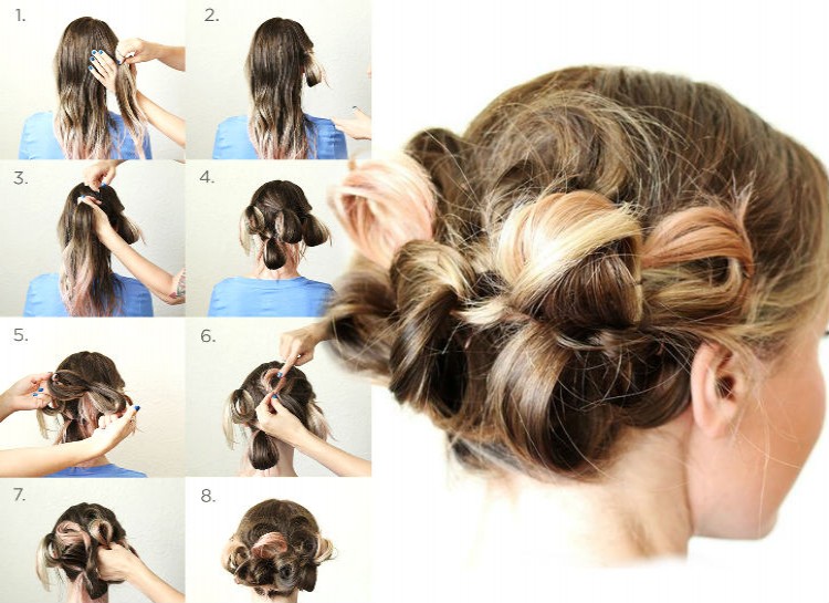 This super simple updo is an easy and unique way to get a fancier look for date nights or events. Make a few large loops in the back of your hair, then pull the loops into small 8-shaped designs. Tease these little loops and pin them down.