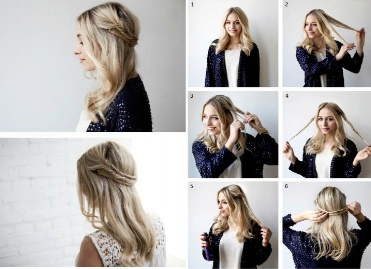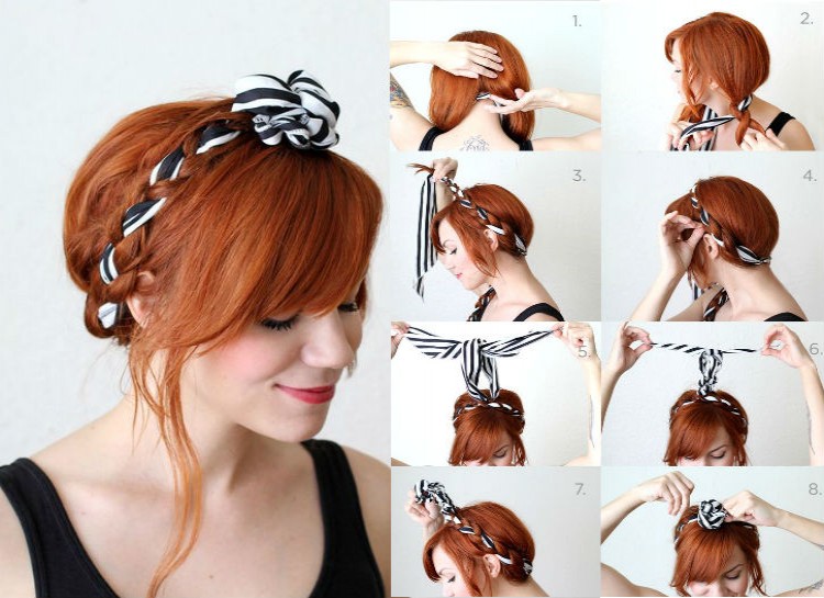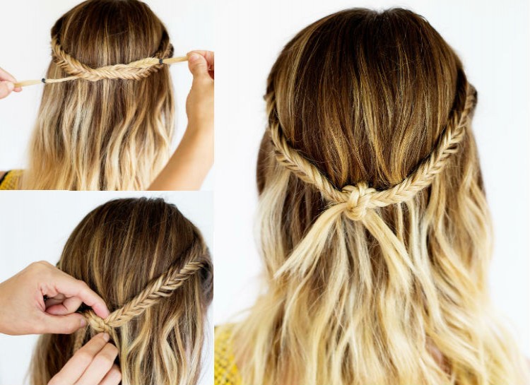 For a super easy headband hairstyle, braid a long strand of hair from each side into fishtails. Cross the fishtails over each other in the back of your head and pin them down