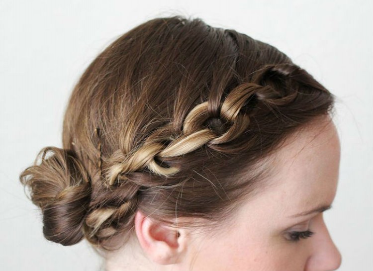 Create a fishtail braid on each side of your head, and then tie them in a knot in the back of your head. Then tie a second knot and remove the elastics from the braids.