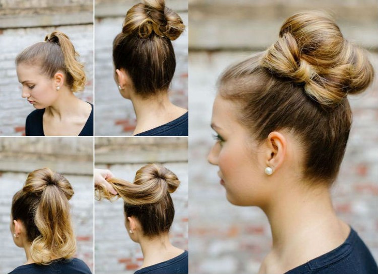 Thanks to “Mad Men,” the ’60s are cool again, and this hairstyle is the perfect match for any vintage outfit. Take three strands of hair from the top of your head, spray them with hairspray, and back-comb it. Next, wrap a loofa in a piece of fabric that matches your hair color and place it under the strands. Cover the loofa with your hair and then pull back strands from the front sides.
