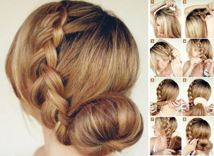 A big braid and bun is a look that will work for any situation. Start by braiding your hair from the center down to one side of your head behind the ear, and gently pull the braids out to make them bigger once in place. Now, make a ponytail and wrap a foam donut around it. Tease the ponytail and then tuck it into the donut so it doesn’t show, and then wrap your braid under it and pin it down.