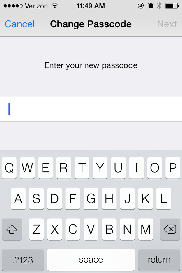 3. A screen will appear prompting you to change your passcode, along with a full QWERTY keyboard. The next time you unlock your phone, the keyboard will appear instead of just the number pad.