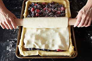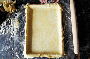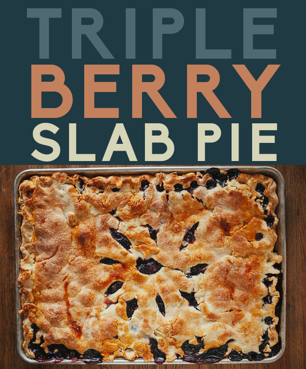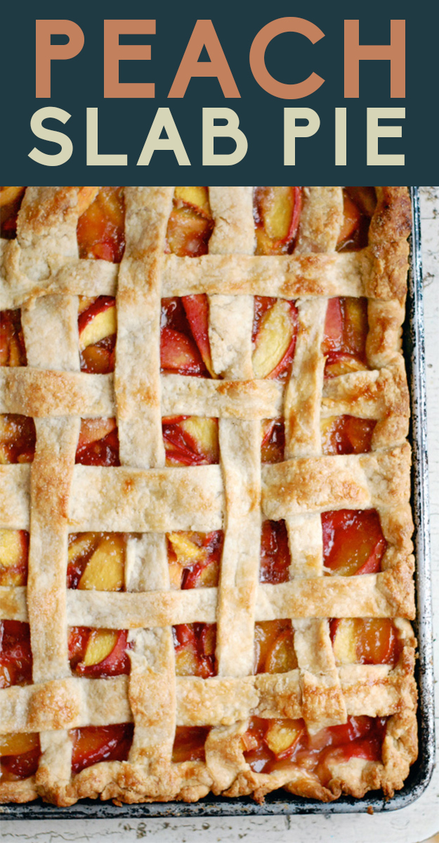Slab pies are made in a rimmed baking sheet (also called a jelly roll pan) so they are slightly shallower than standard pies and can feed more people.
