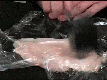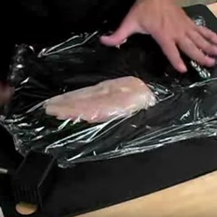The trick is: Laying plastic wrap over the chicken, then pounding it with a meat mallet. Watch the video here here.