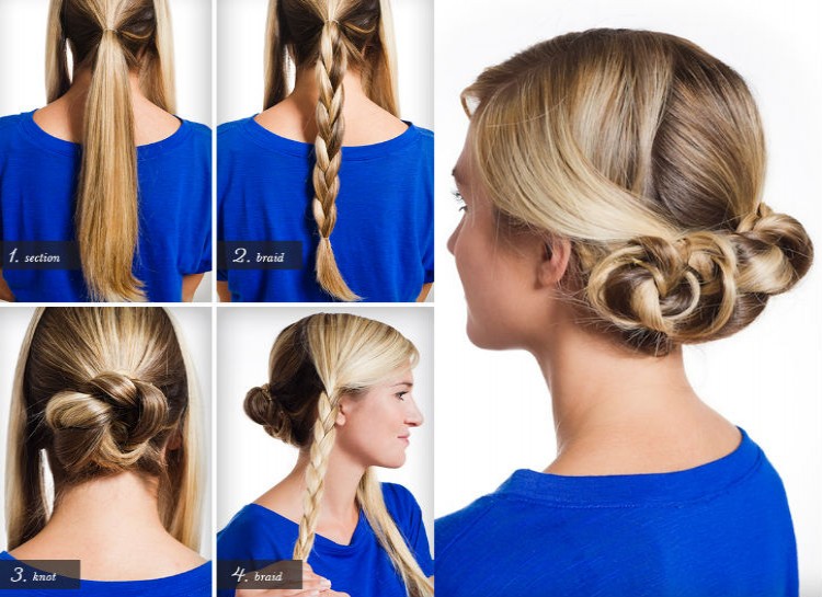Separate your hair into three sections, and braid the middle section. Tie the braid into a knot and secure it with a bobby pin. Braid one of the side strands and tie it into a knot right next to the first one and pin it down, then do the same for the final strand.