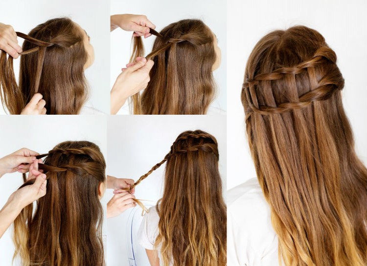 Begin by separating a strand of hair into two sections, and then twist the bottom section over the top one. Now, take a new section of hair from above and lay it over the strand you just put on top. Now bring the original strand that’s on the bottom now and twist it over the piece you just laid down. Continue this process by continuing to cascade new strands from above between the two original strands. Repeat the process a few inches below the braid, using the same cascading pieces again.