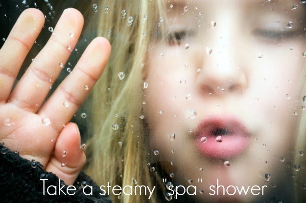 Plug the drain when taking a hot shower then add scented or epsom salts to the water. Instant trip to the spa while the baby takes a nap.