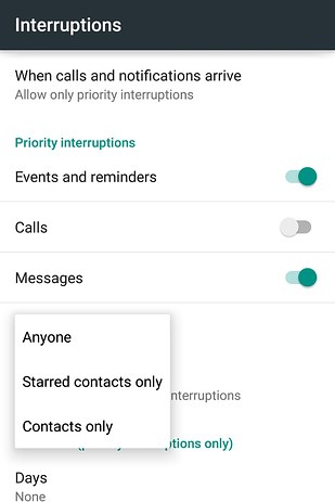 Android 5.0 Lollipop introduced “Priority mode,” a new feature that allows interruptions only from contacts you designate. Turn on Priority mode by pressing any volume button. Tap the settings gear to customize which calls and texts will go through.